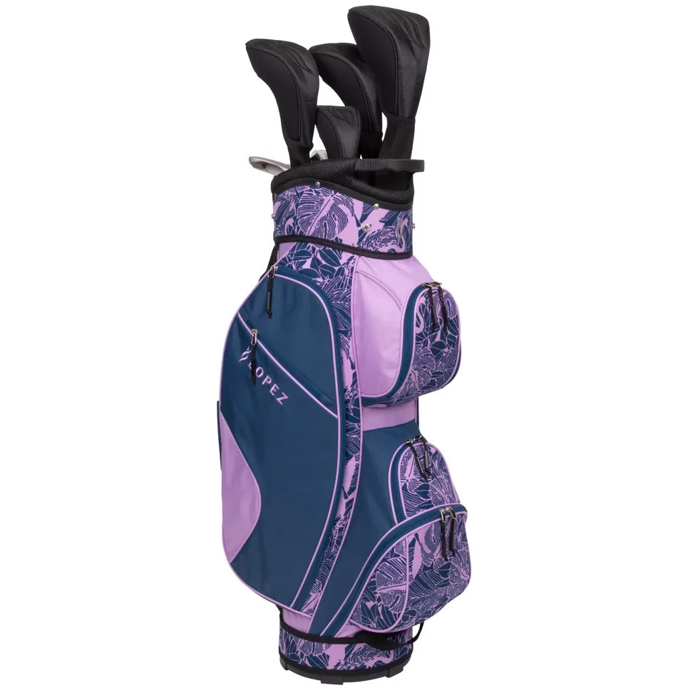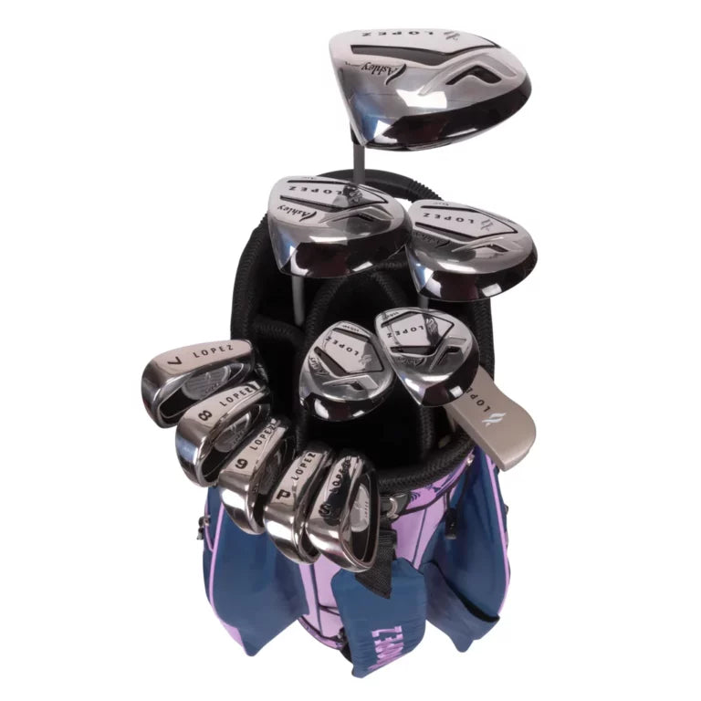 L'ensemble Ashley 11 pièces amélioré perpétue notre tradition de fabrication de bâtons de golf de haute qualité, bien équilibrés et faciles à manier, que nos clients Lopez Golf attendent avec impatience. Ce coffret comprend le nouveau décocheur Ashley 14⁰ en aluminium, des bois de parcours 3/5 en aluminium, des bois hybrides 4/5, des fers 7/8/9/PW/SW, un putter et un nouveau sac chariot léger et tendance en nylon 600D. Les nouveaux shafts en graphite ultra-légers améliorés avec grips en caoutchouc souple vous permettent de donner le meilleur de vous-même. Ce sac léger en nylon est désormais doté d'un compartiment supérieur à 7 compartiments pour protéger vos clubs, d'une bandoulière rembourrée, de 7 poches zippées pour un rangement optimal, d'un porte-parapluie, d'une housse de protection en nylon, d'un anneau porte-serviette, d'un porte-gants et de poignées en haut et en bas.