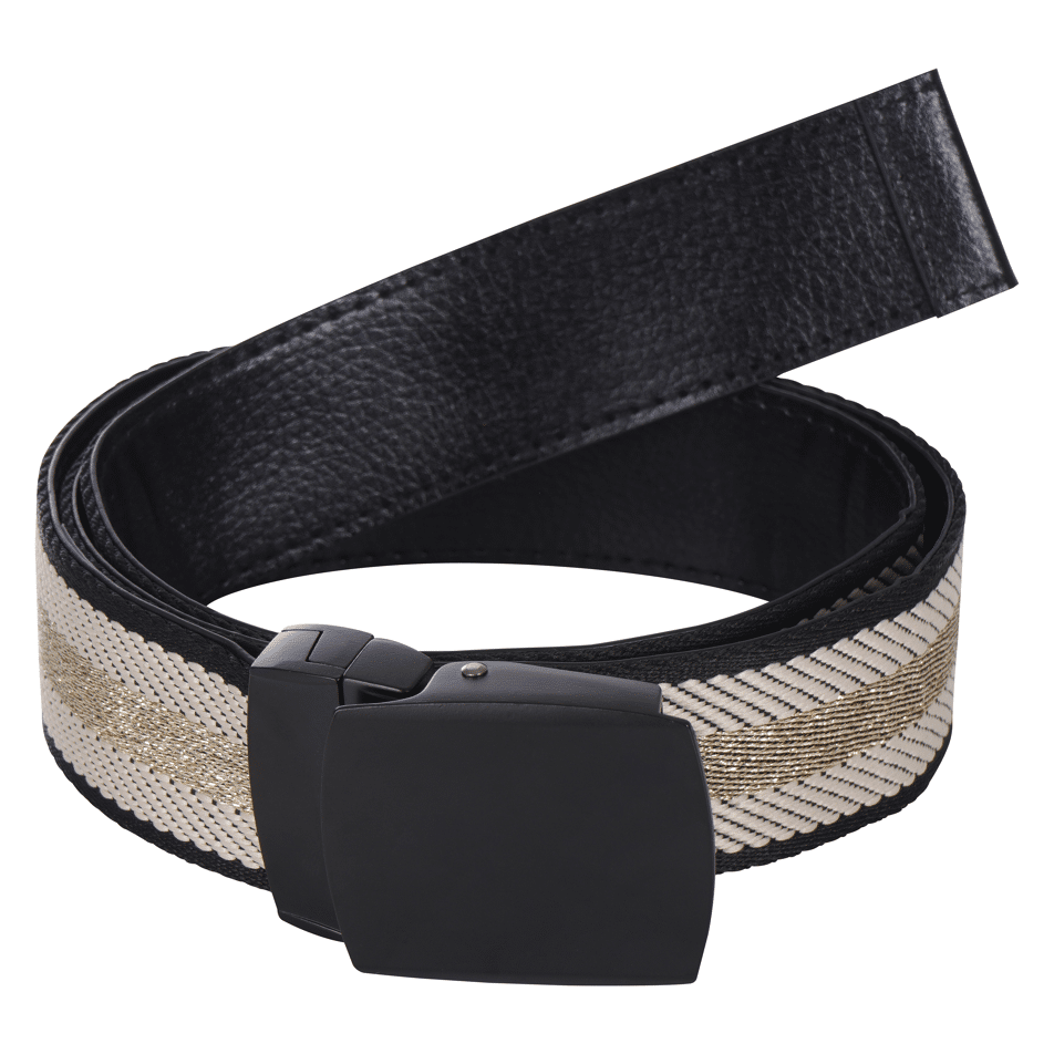 La ceinture Luhta est l'accessoire idéal pour compléter n'importe quelle tenue. Cette ceinture polyvalente est dotée d'une boucle rotative en métal noir , vous permettant d'alterner facilement entre deux looks élégants : un côté sportif en tissu rayé ou un côté élégant en similicuir noir .