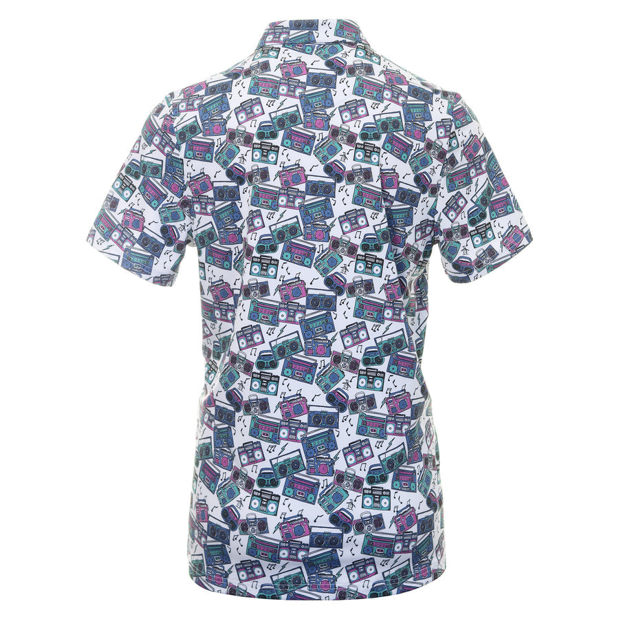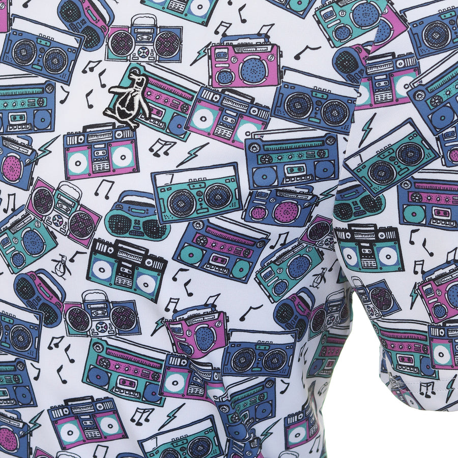 Polo imprimé Boombox Heritage Original Penguin Golf pour homme. Un polo à patte de boutonnage à 3 boutons fabriqué à partir d'un tissu évacuant l'humidité. Le système de gestion de l'humidité OPG vous gardera au frais et au sec tout au long de votre partie. Le tissu extensible ajoute du confort pour un swing sans frottement.